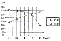 采用HX-200型顯微硬度計,在加載50g條件下對采用不同進給量切削時的工件表面顯微硬度進行測量。圖4所示為用PCD刀具和SPD刀具切削加工得到的表面顯微硬度值隨進給量的變化曲線。